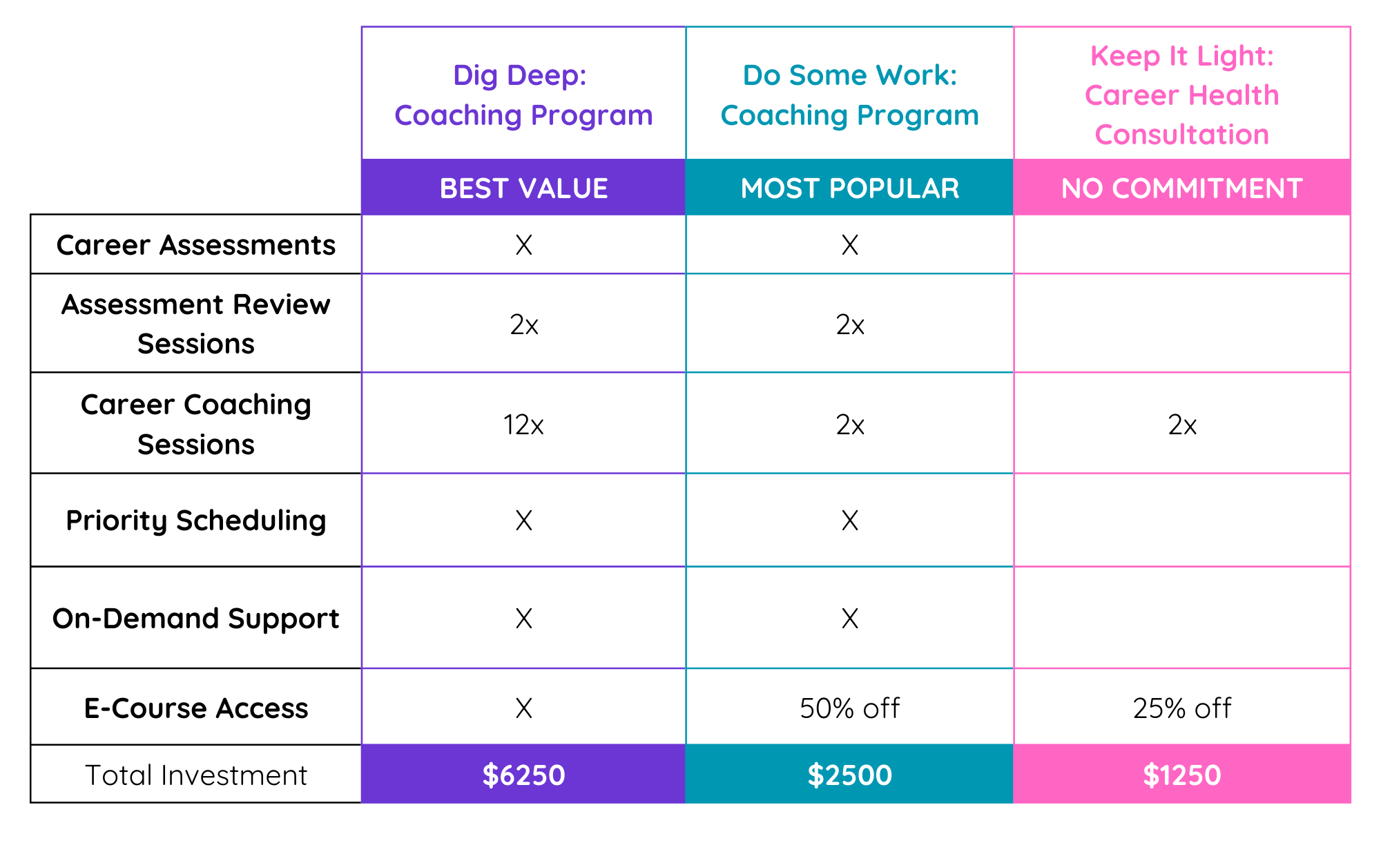 The Career Health Assessment is a 1-month, package targeted at identifying and addressing underlying career alignment and health issues. This is the best place to start for an in-depth, highly personalized, short-term career consult to get to the root cause and clear underlying issues that lead to burnout, satisfaction, energy, and career longevity issues.